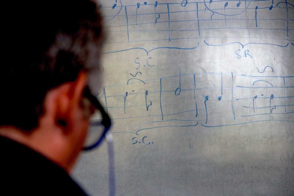 Trabajo intenso en las salas de la Escuela Taller de Águila Sur, para dar inicio al Método Sicura Chilena. Pentagrama y Notas quedaban registradas en la pizarra de la Escuela.